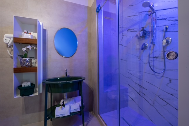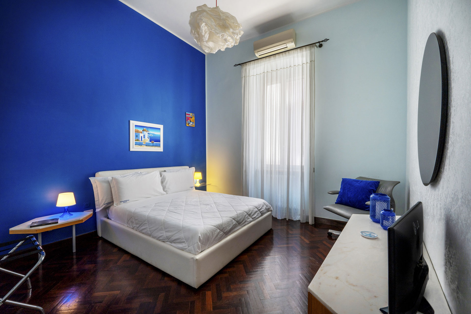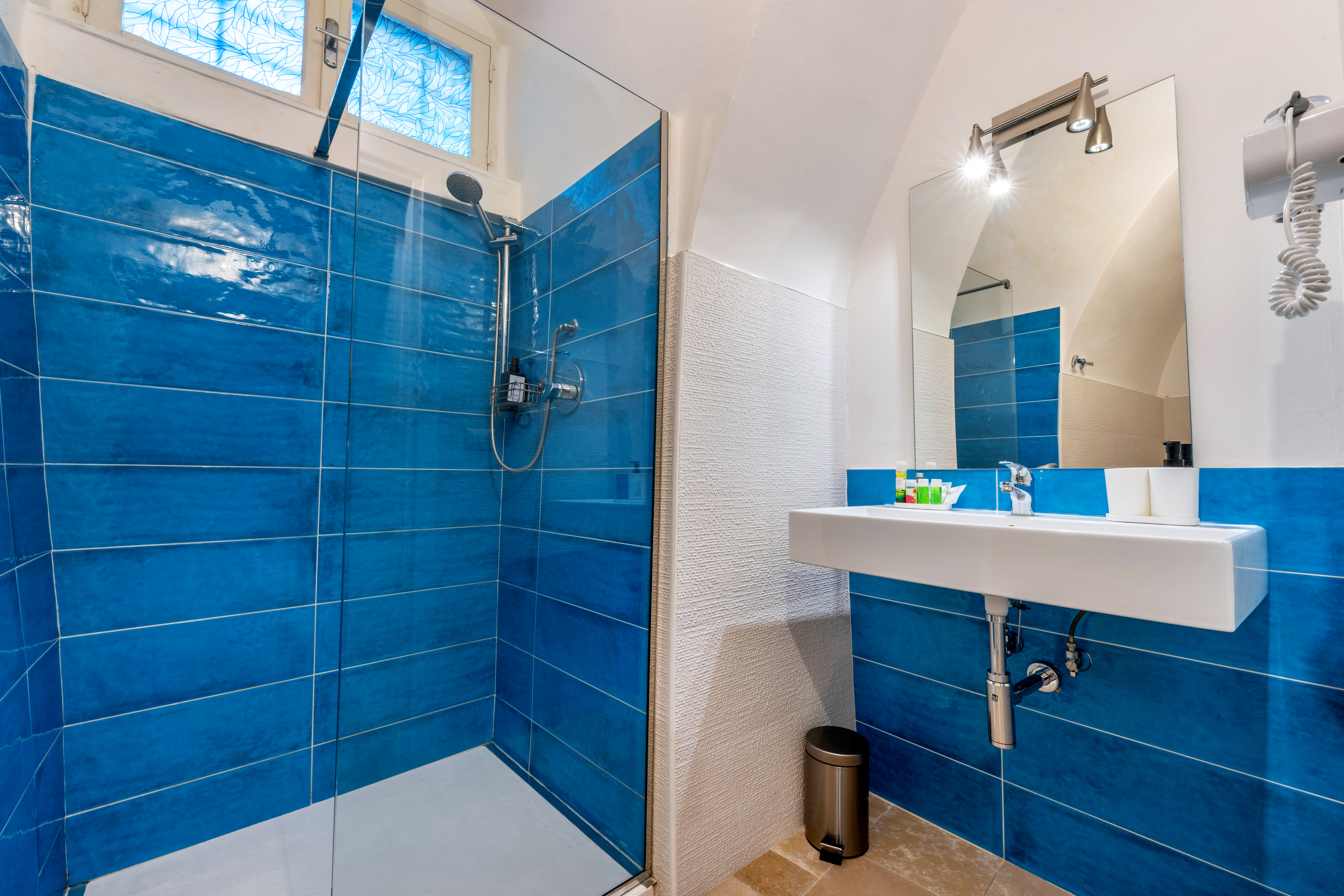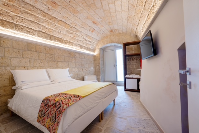 Located at 70 Via Ognissanti, a street dating back to the period of the Crusades that departed for the Holy Land right from the church of Ognissanti. The room, dating back to 1700, with barrel vaults, walls in local tuff and Trani stone, is furnished with natural elements such as iron and wood to create a modern decor in complete harmony of colours and styles. Bathroom with Apulian ceramics expertly hand-decorated by masters from Grottaglie, recalling the blue of the sea, freestyle washbasin and large shower with waterfall. The whole creates a very refined and relaxing ambience.