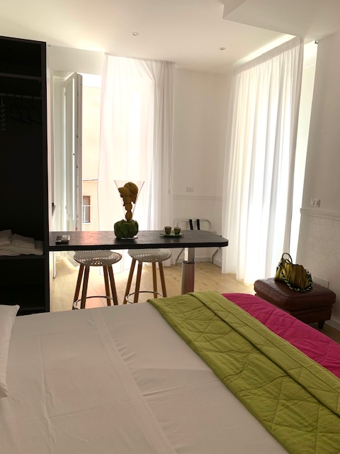 Located at Vico Forno Vecchio 7, the family room enjoys views of church rooftops, and a beautiful glimpse of the cathedral's bell tower. decorated in soft, relaxing colours. The room has a bathroom with a large shower and a fully equipped kitchen.