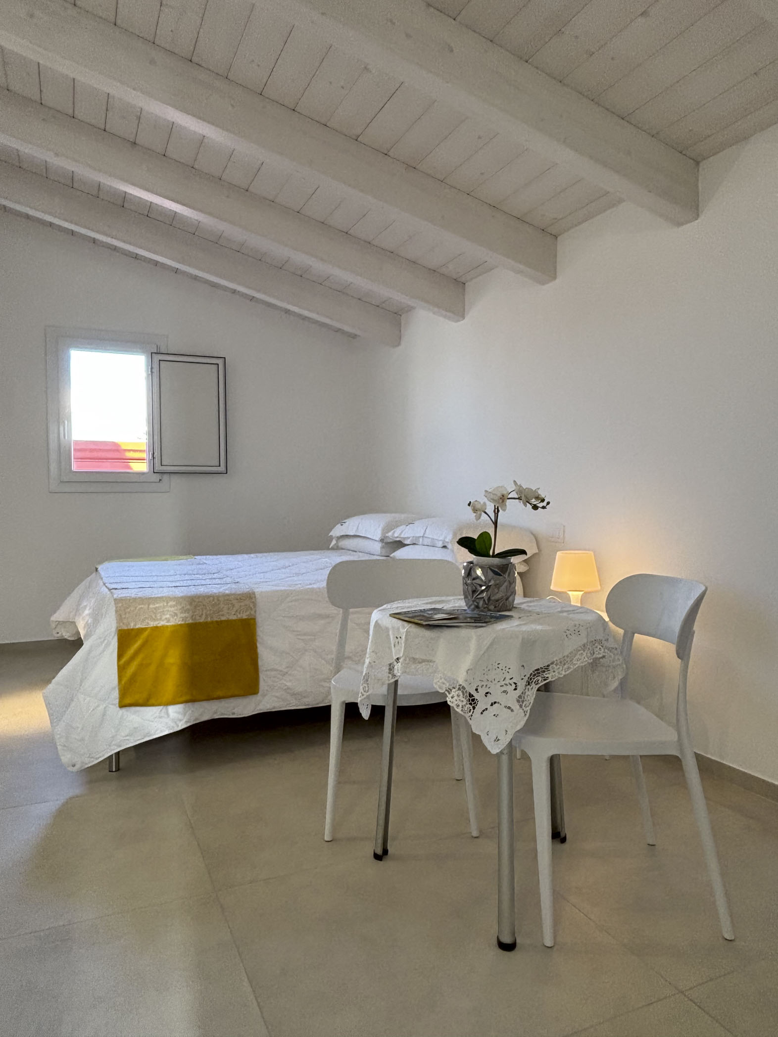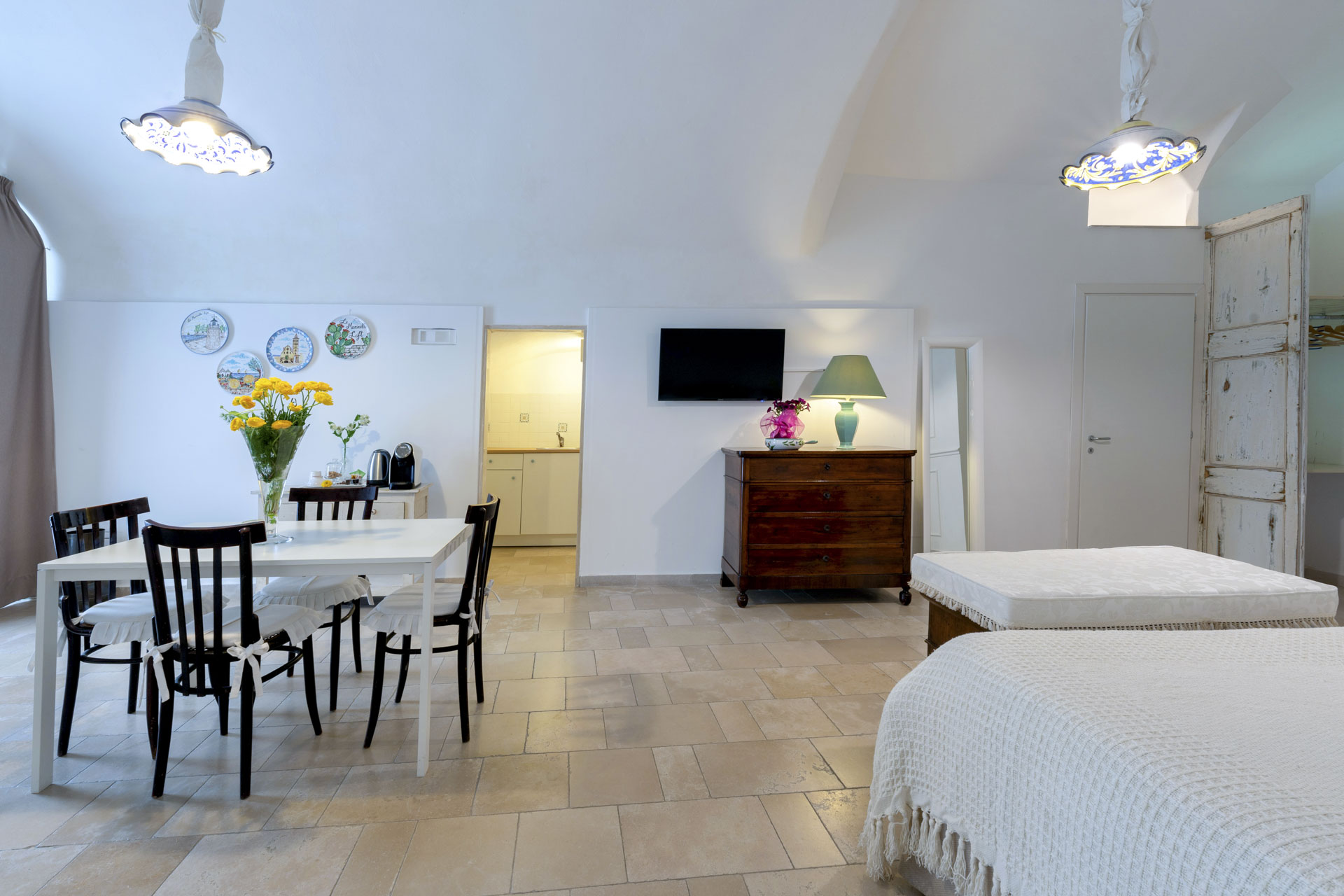 Located in Via Carrettieri 22, ground floor, with its own entrance, this studio apartment is furnished taking inspiration from typical Apulian masserie, with white walls and fabrics adorned with lace typical of the early 1900s, period furniture and ancient stone (biancone di Trani), which complete the furnishings of these 55 square metres dedicated to Apulian tradition and hospitality.