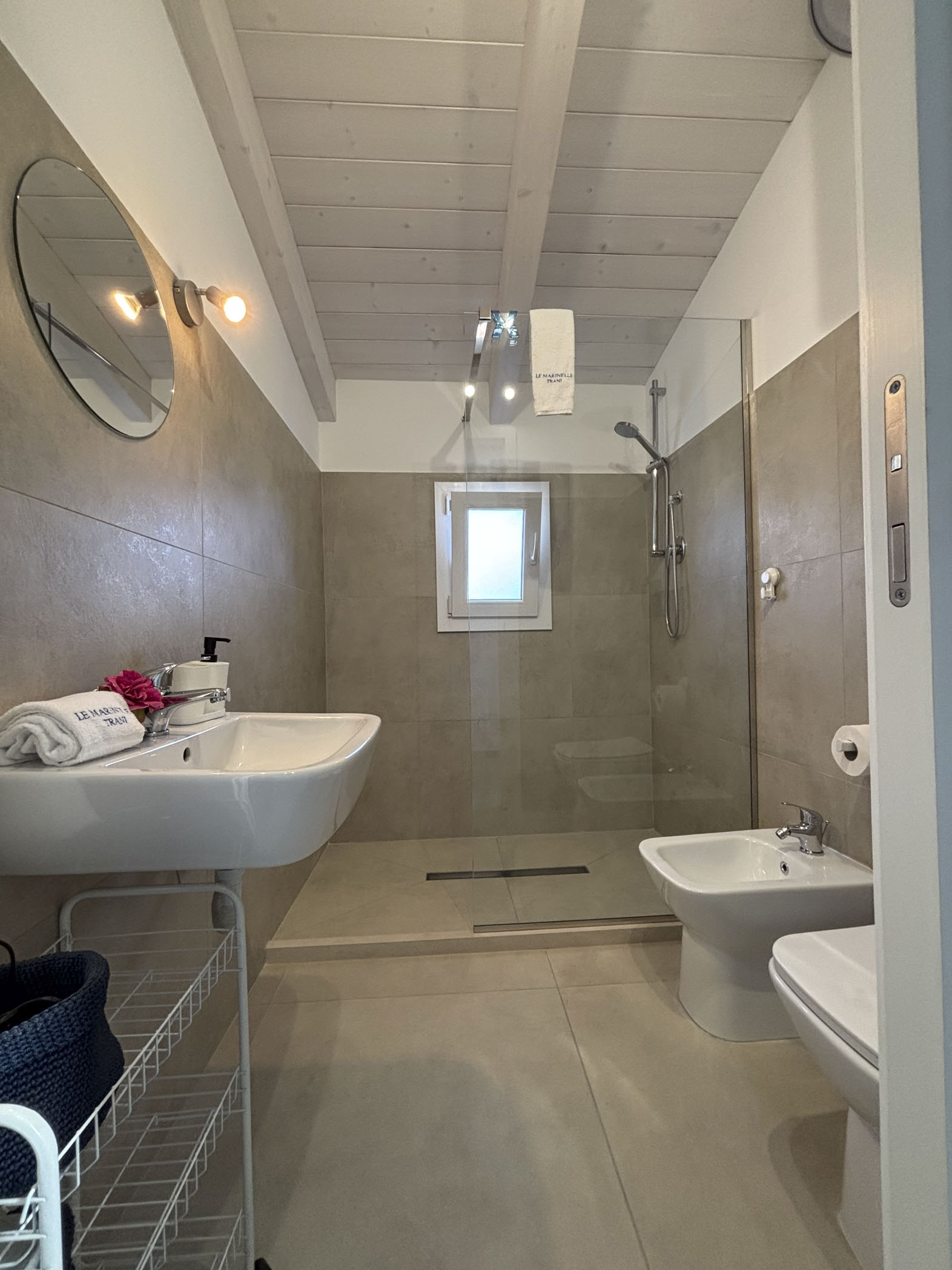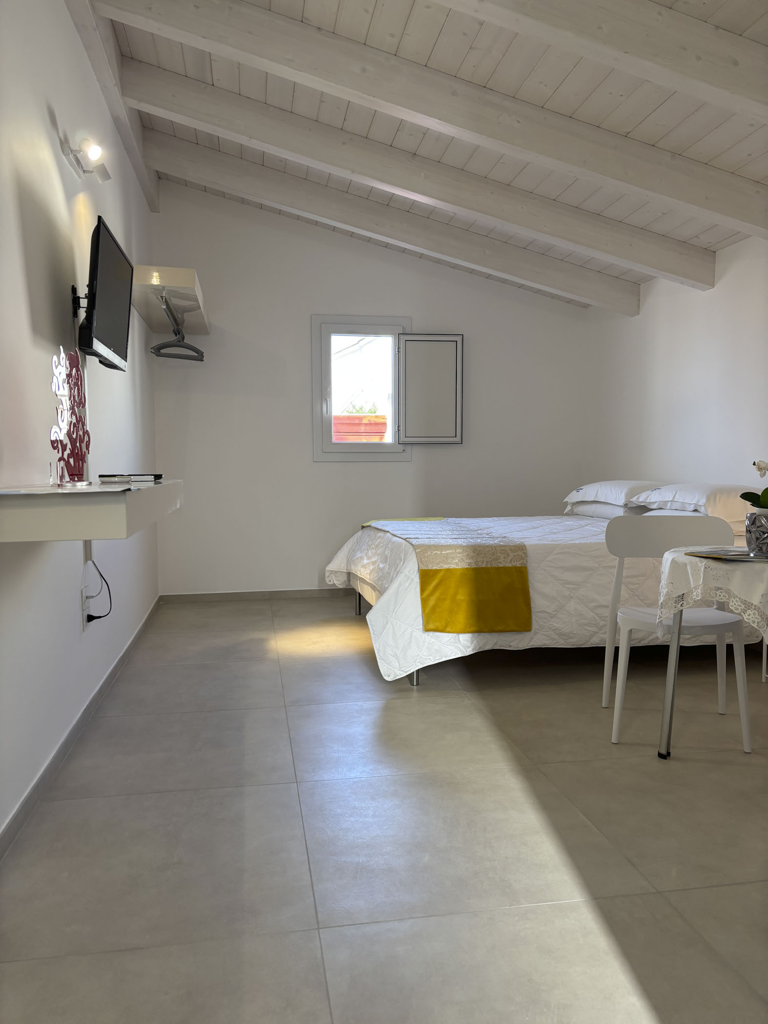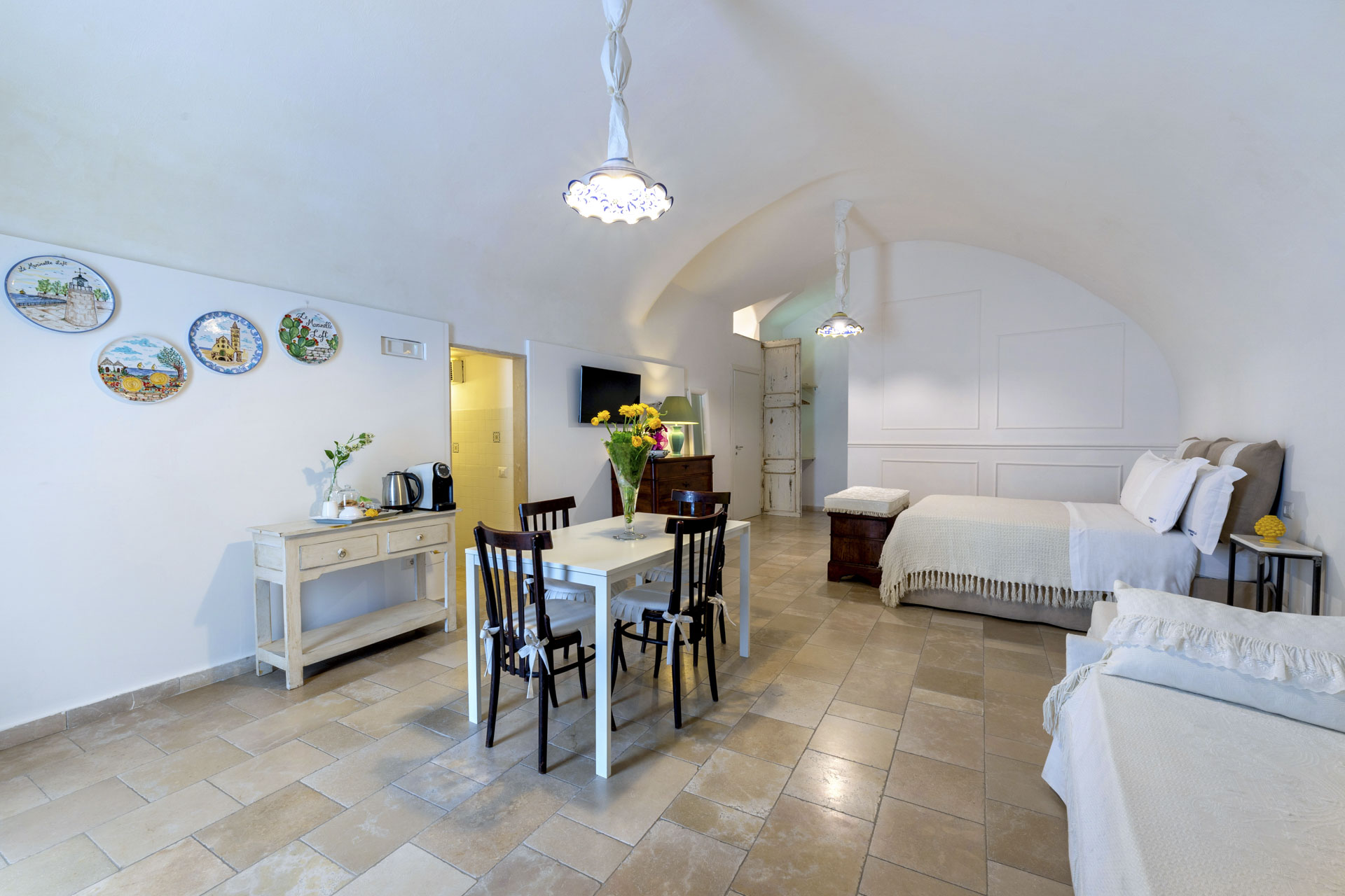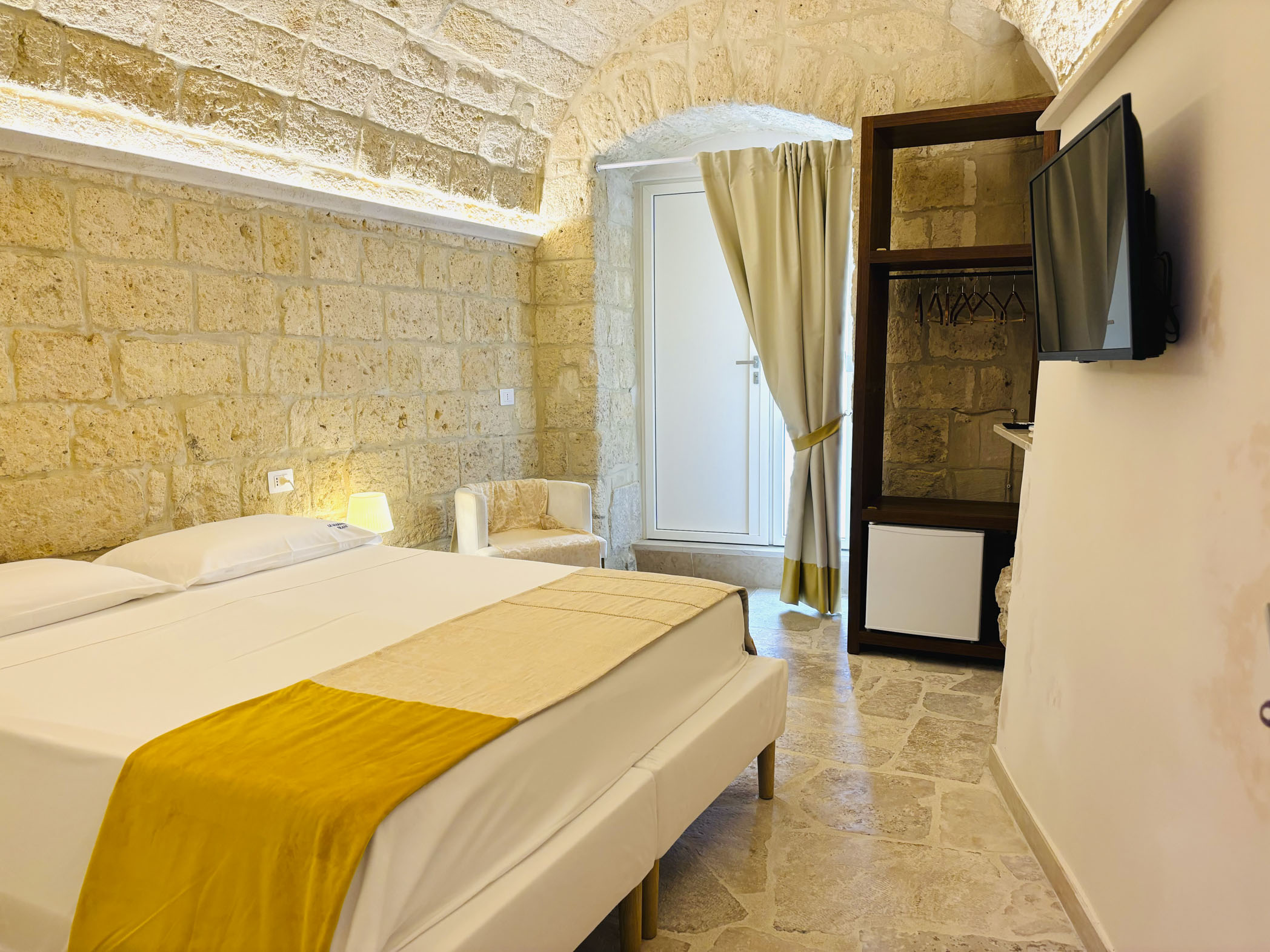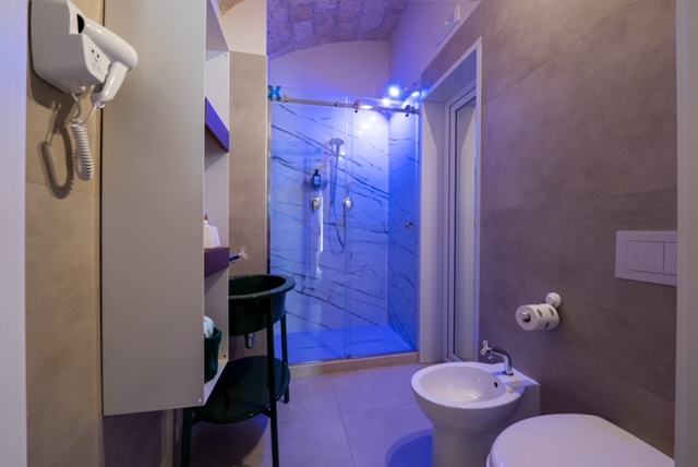 Located at Vico La Rosa 11, the room was once part of a former convent, with barrel vaults in local tuff and a floor of original Apulian chianche salvaged from the renovation and skilfully restored. furnished with refined and natural elements in complete harmony of colours and styles. bathroom with caracatta cladding in the colours of green, large shower with seat and jet cascade, free style washbasin in the colours of green that recall the gold colour of our and Puglia's olive trees. All this creates an environment in which to relax and spend a stay to remember.