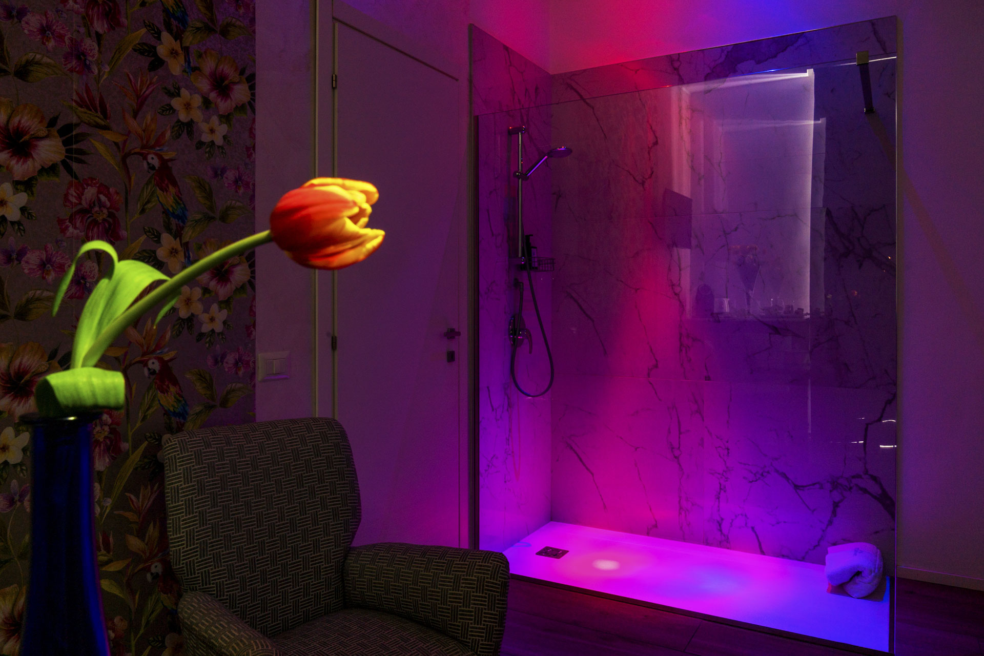 Located at Via Lorenzo Festa Campanile 16, the elegant and bright room has a distinct and modern style. The exposed caracatta shower in the room with chromotherapy and a multicoloured wallpaper complete the refined décor, blending in harmony for a stay of well-being. It features a balcony equipped with a table and chairs with a view of the picturesque city streets.